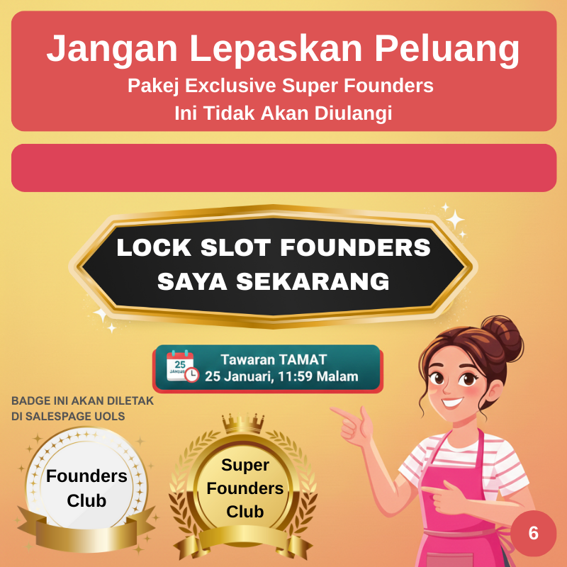 Pakej ni hanya untuk 200 pendaftaran pertama dan pakej ini tidak akan diulangi di masa hadapan. Cukup quota 200 pendaftaran, pakej "Founders Club" ini akan ditutup selama-lamanya.