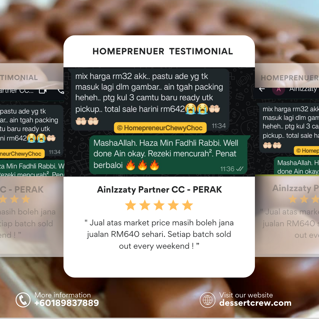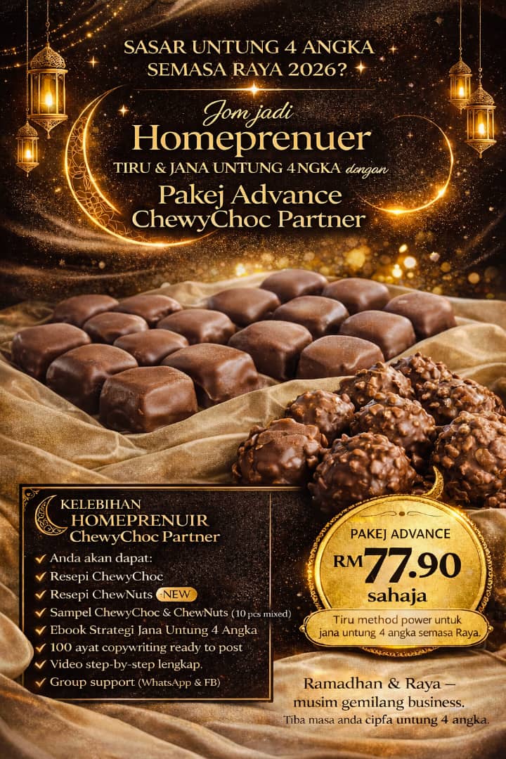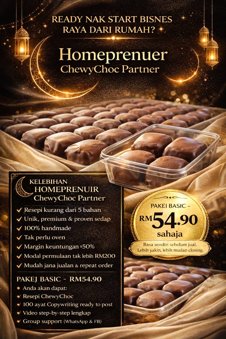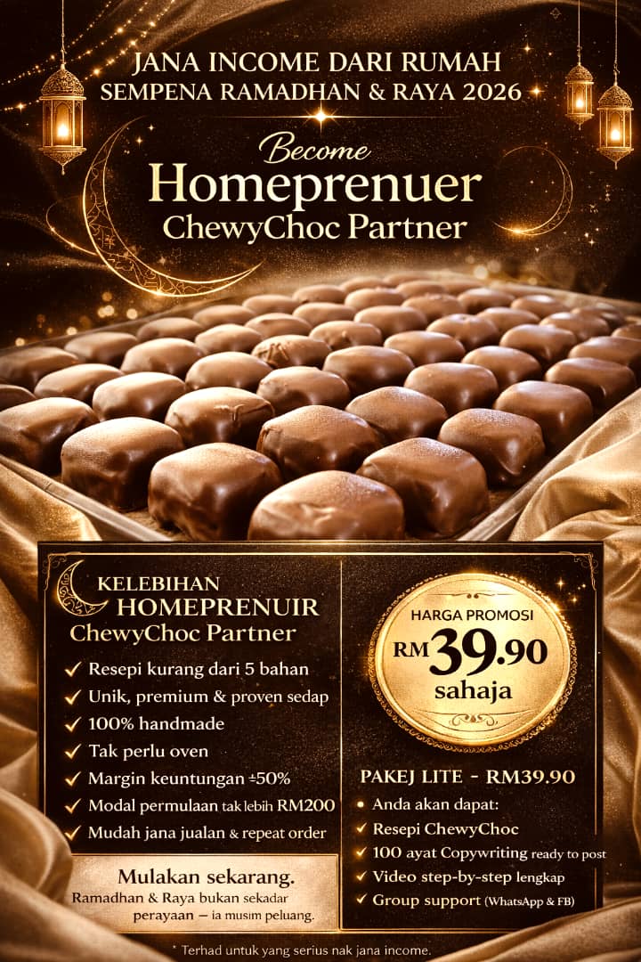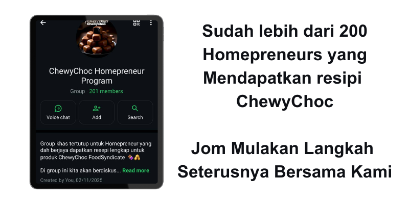 Program Homepreneur ChewyChoc ini boleh ditutup pada bila-bila masa sahaja. Jangan lepaskan peluang untuk daftar. Kami dan komuniti Homepreneur ChewyChoc akan bimbing anda dari A-Z.